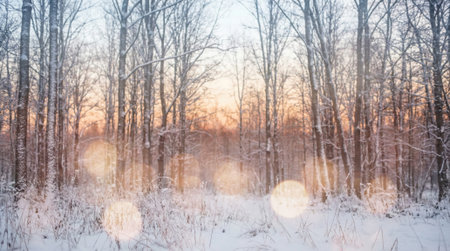 A beautiful and serene winter landscape featuring a snow covered forest with bare trees illuminated by the warm golden light of the rising sun creating a magical bokeh effect.