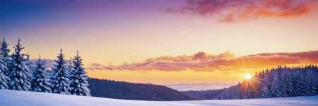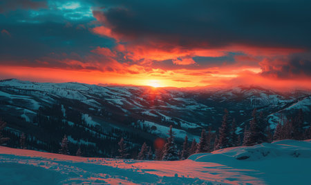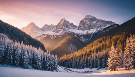 Mesmerizing winter sunset over snowy mountain landscape with pine trees.