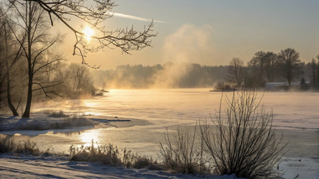 Tranquil Winter Landscape with Misty Reflections on a Frozen Lake Surrounded by Snowy Trees