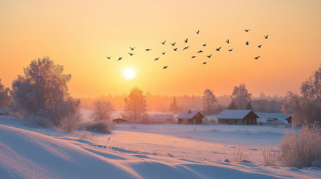 Birds fly as the sun sets over a tranquil, snow-covered winter landscape