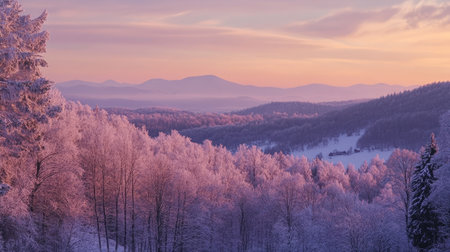 A wintry sunrise casting a soft pink light over snow-covered hills and mountains