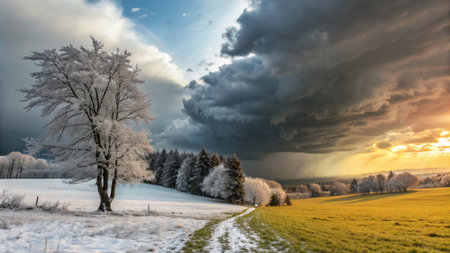 A stunning landscape showcases a contrast between winter and a stormy sky, with a path leading through the scene.