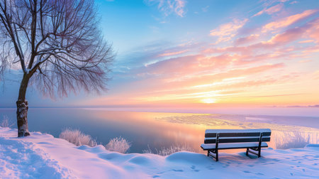 A beautiful winter landscape featuring a snow-covered bench under a bare tree, with tranquil waters reflecting a stunning sunset in pastel hues.