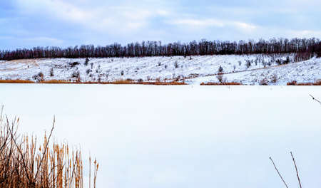 A frozen lake covered with white snow, trees grow along the banks. Ukraine