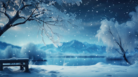 lakeside view during winter, where snow blankets the surroundings, trees stand still, and the icy water surface mirrors. Generative AI