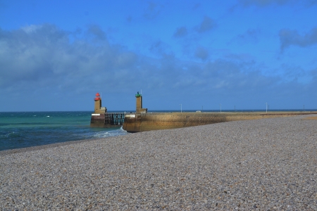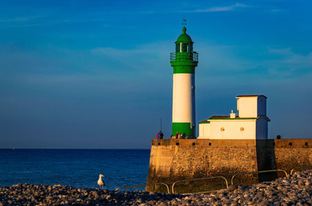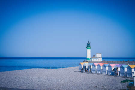 A beach and a way to the lighthouse near white cliffs and English Channel on a clear day. Fécamp, Normandy, France. Blue sky, azure water. Nature, history, past, national landmark, sightseeing, travel