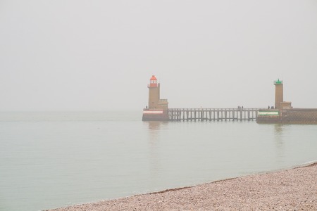 The lighthouses that form a beacon in the port of Fecamp, Normandy, France on a grey and misty day