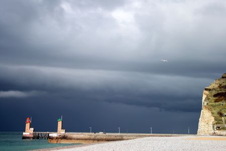 The beach and cliffs of Etretat with a gloomy sky, tourist site of a Norman French town