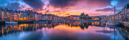 The vibrant harbor of Honfleur is illuminated by a warm sunset, casting reflections in the serene water. Quaint buildings line the waterfront, enhancing the coastal charm of Normandy.