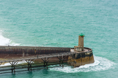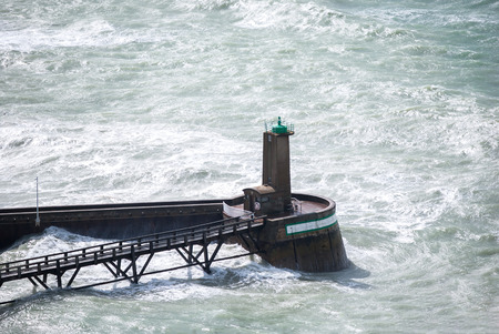 Lighthouses and guidance at the entrance of the Port of Fecamp, Normandy, France, Europe on the coast of Normandy in the English Channel in Autumn. Seascape with waves.