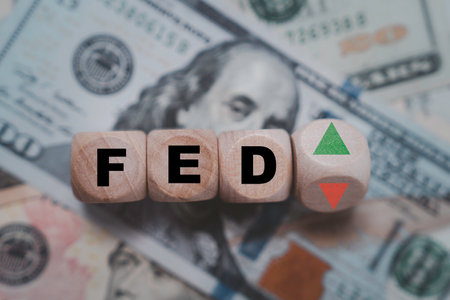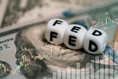 Federal Reserve concept with FED dice on US dollar and financial chart represent interest rate decision, monetary policy impact, inflation control, stock market and currency analysis background.