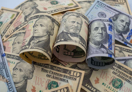 US dollars bundle close up isolated on dollar background. Paper denominations of dollars cash rolls with rubber bands. Business budget of wealth and prosperity finance. Pile capital of American US dollars bills notes cash