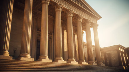 Neoclassical courthouse with grand steps and columns in golden light
