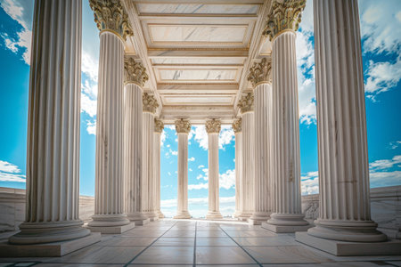 Beneath a stunning blue sky, towering classical columns create an impressive architectural space, highlighting intricate details and serene ambiance.