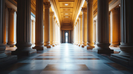 The grand entrance of a stately neoclassical building is bathed in the warm light of the golden hour. The architecture features massive columns,an arched wooden door,and detailed sculptural friezes,conveying a sense of history,authority,and justice.