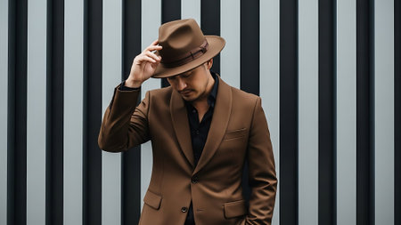 A man in a brown suit and hat stands against a striped wall.