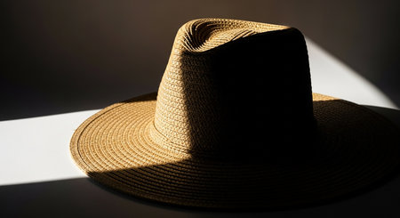 A woven straw fedora hat sits on a wooden surface with dramatic shadows cast by sunlight.