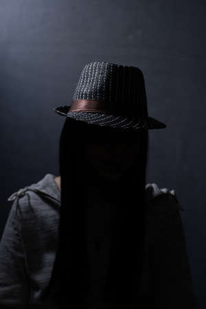 Girl silhouette in hat near wall