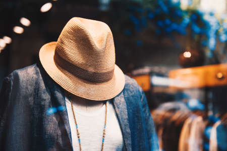 Straw hat on the background of the street in the city.