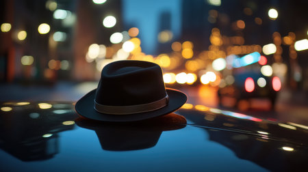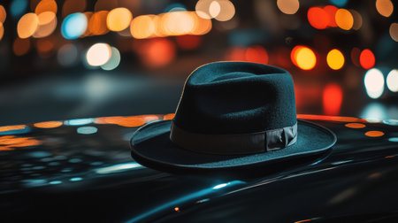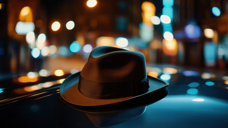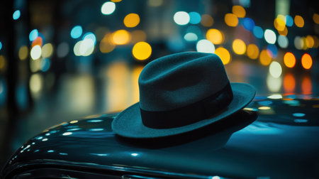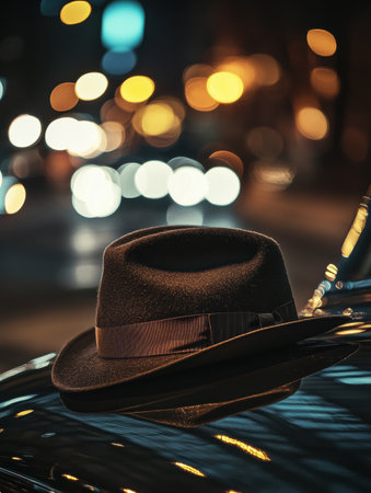 A classic gentleman's hat is placed elegantly on the hood of a vintage car, capturing the essence of a nostalgic urban evening.