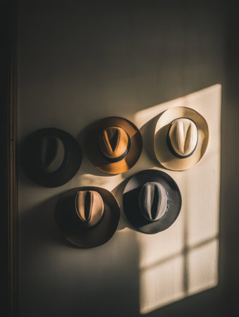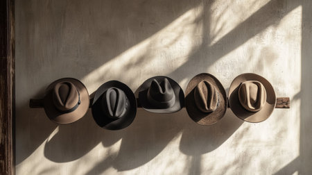 Several classic fedora hats arranged on a wall are beautifully illuminated by sunlight, enhancing their vintage charm and texture.