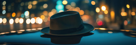 A stylish gentleman's hat is placed elegantly on a vintage car's hood, illuminated by sparkling city lights at night.
