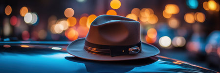 A classic gentleman's hat is placed atop the hood of a vintage car, with vibrant city lights creating a stunning nighttime ambiance.