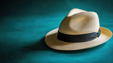 A classic straw hat adorned with a black band rests elegantly on a vibrant turquoise surface, symbolizing summer style and leisure.