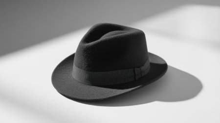 A striking black fedora hat rests elegantly on a white surface, capturing a sense of timeless style and sophistication through dramatic shadows and minimalist design.