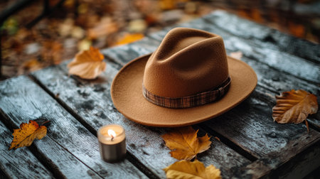 A charming autumn scene featuring a brown hat and a lit candle placed on a rustic wooden table. Surrounded by colorful fallen leaves, the setting exudes warmth and tranquility, perfect for capturing the essence of the season.