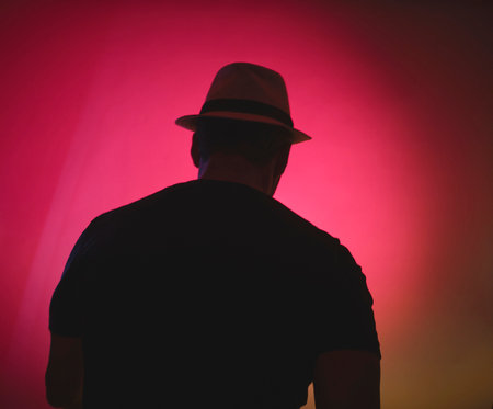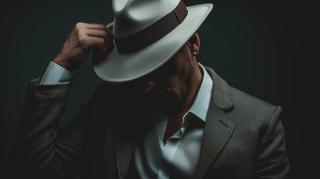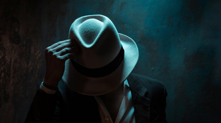 Mysterious man wearing a stylish hat, gazing contemplatively at a dark gray wall, embodying solitude and elegance in a minimalist setting