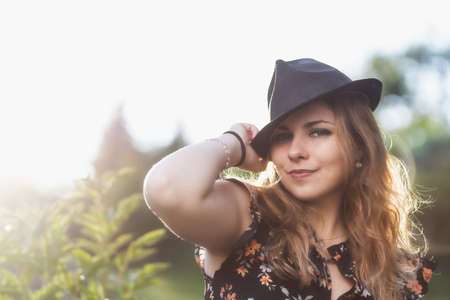 Attractive young girl wearing a black hat is posing outdoors looking at the camera.