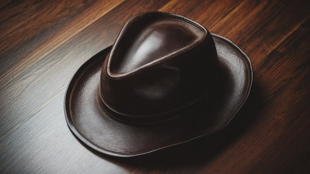 A luxury leather hat displayed on a dark wooden surface, with soft shadows and room for copy above.
