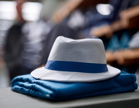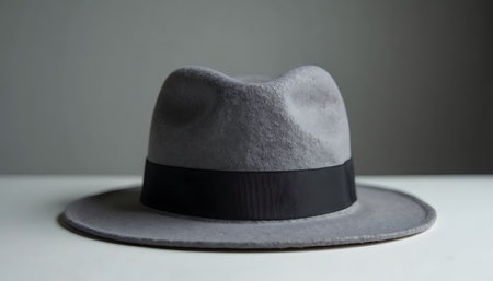 a stylish gray hat rests casually on a study table, its public hat design showcasing its sleek silhouette. captured in pristine detail with natural lighting and a gray background, this photograph exudes a sophisticated and minimalist aesthetic. ai generated