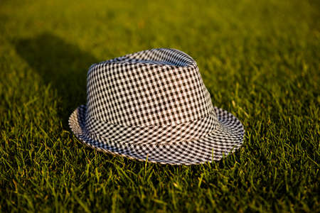 A White Fedora hat was on fur carpet background