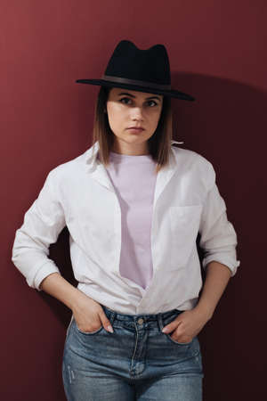 Fashion portrait of beautiful girl in youth style. Smiling joyful woman studio portrait wearing hat and white shirt. Burgundy background wall.