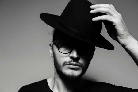 Black and white portrait of young serious guy, hides eyes with hat on grey.