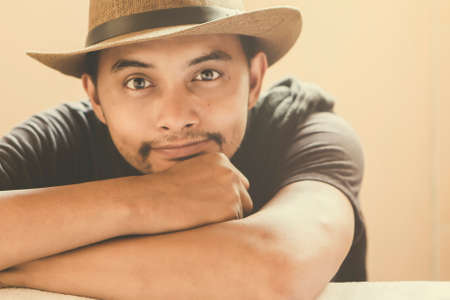 Attractive man sitting smiling under warm light .Cowboy style with a mustache and a hat