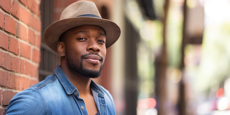 Confident Man Wearing Hat and Denim Shirt Smiling Outdoors on a Sunny Day.