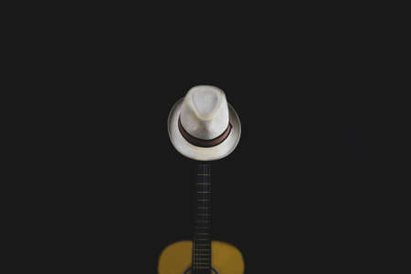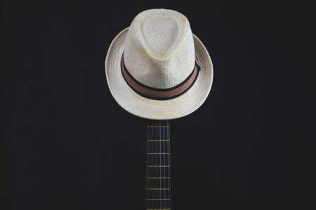 White hat hangs on the guitar fretboard. acoustic musical instrument. strings on the guitar neck close up