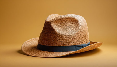 Casual showing straw fedora hat with dark ribbon band on draped fabric keywords: hat, straw, fedora, woven,...