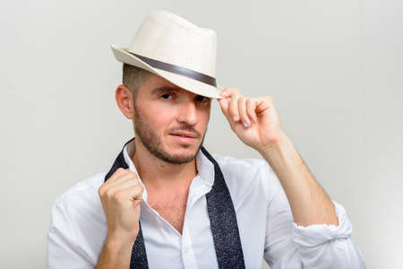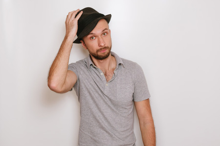 Studio portrait of young man taking off the hat from head on grey background.