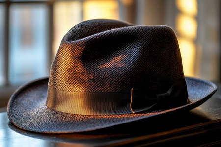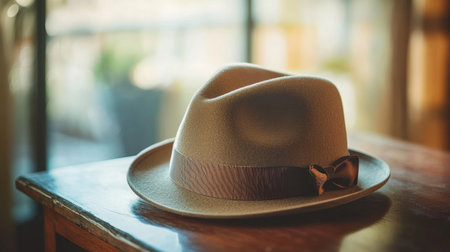 Close-up of a stylish fedora hat with a ribbon band, placed on a wooden table with a soft focus background