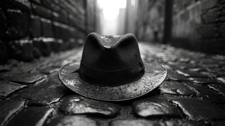 A black-and-white photograph of an old, worn hat lying on the cobblestone street in front of ancient stone walls. The photo captures the mystery and depth associated with noir-style detective stories. --chaos 30 --ar 16:9 --stylize 750 --v 6.1 Job ID: 732d416f-dd86-4860-9010-197fa497915f