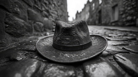 A black and white photograph of an old, worn hat lying on the cobblestone street in front of ancient stone walls, symbolizing mystery and intrigue. The hat is placed at the center of the frame with its brim resting gently upon the cobbled ground. This composition creates a sense of adventure, as if it was left by someone who just departed in the style of a noir film. --chaos 30 --ar 16:9 --stylize 750 --v 6.1 Job ID: 57c1481e-965c-4feb-a211-7d0818594bc4