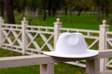 white stylish unisex hat on the fence.