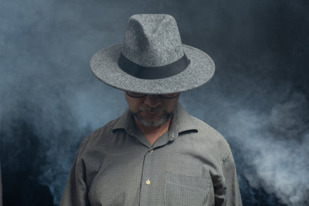 Portrait of man with beard and sunglasses and hat posing for photography. Against smoky background.