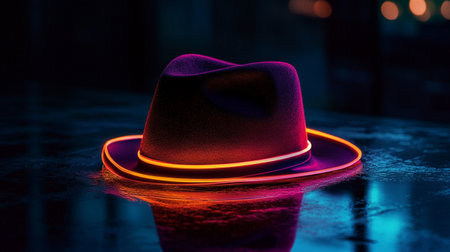 A stylish gentleman's hat is placed elegantly on the hood of a vintage car, glowing under the bright lights of a bustling city at night.