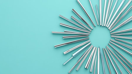 This image features an artistic arrangement of metallic rods radiating from a center point against a soothing aqua background. Perfect for design use!