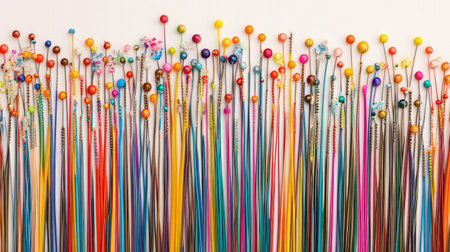 A vibrant collection of sewing pins and colorful threads create an artistic display, perfect for craft projects and design inspiration in creative spaces.